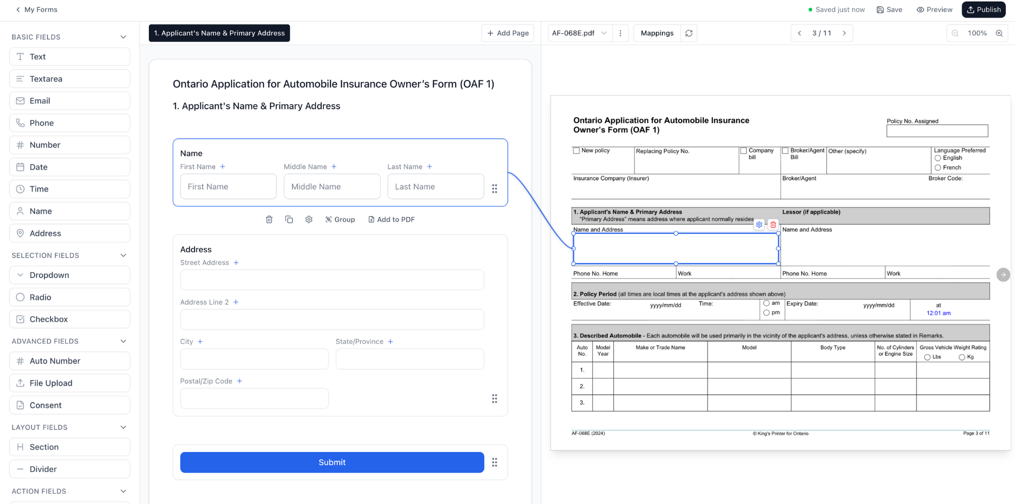 Build smart online forms that map directly to your PDF templates. Collect data, manage submissions, and export filled documents.